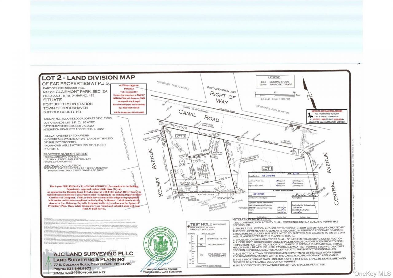 Incredible opportunity calling all builders, developers, and end users - this is a 100% shovel-ready, single and separate building lot connected to 99 Central Ave, Port Jefferson Station, with your future curb cut on Canal Road and a new address to be assigned for a 2100 square-foot house not including garage. Building permits are expected within weeks, allowing you to avoid the hassle of navigating Brookhaven delays and lengthy approval timelines. The property includes stamped plans and full Board of Health approval, eliminating the red tape and positioning you to move directly into construction. Situated on approximately 8,000 square feet in the Comsewogue School District, this lot is approved for a three-bedroom home with an additional first-floor office or optional bedroom, two full baths, one half bath, and a full basement with outside entrance. The only responsibility for the builder will be removal of the existing cottage, creating a streamlined, high-upside project where you can break ground quickly and capitalize on a rare ready-to-build opportunity. House is turned front door faces Kelsey