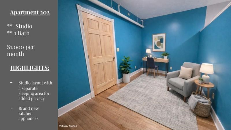 Completely remodeled studio apartment located in the heart of Downtown Waterloo. This brand-new unit features all new finishes throughout, including updated flooring, modern appliances, and a fresh contemporary design. The building offers convenient amenities such as an elevator, an upcoming on-site laundry room, and a small fitness/workout room for tenant use. Enjoy the convenience of downtown living with shops, dining, and local attractions just steps away. Rent: $1,000 per month Utilities: Tenant responsible for Water/Sewer and Electric. A great opportunity to live in a newly renovated space with modern amenities in a prime location. Some photos may contain virtual staging for marketing purposes only. Furnishings, d?cor, and layouts shown in staged images are illustrative and are not included with the apartment.